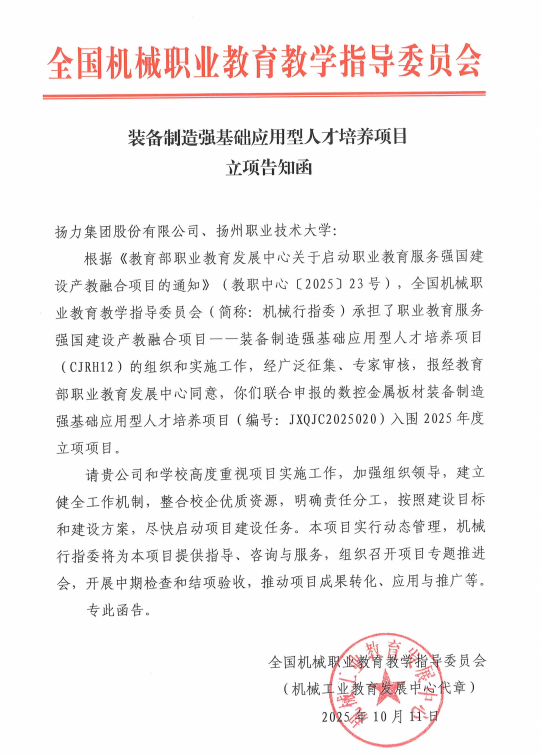 近日,学校与扬力集团股份有限公司联合申报的“数控金属板材装备制造强基础应用型人才培养项目”获全国机械职业教育教学指导委员会批复,成功立项教育部职业教育服务强国建设产教融合项目——装备制造强基础应用型人才培养项目。