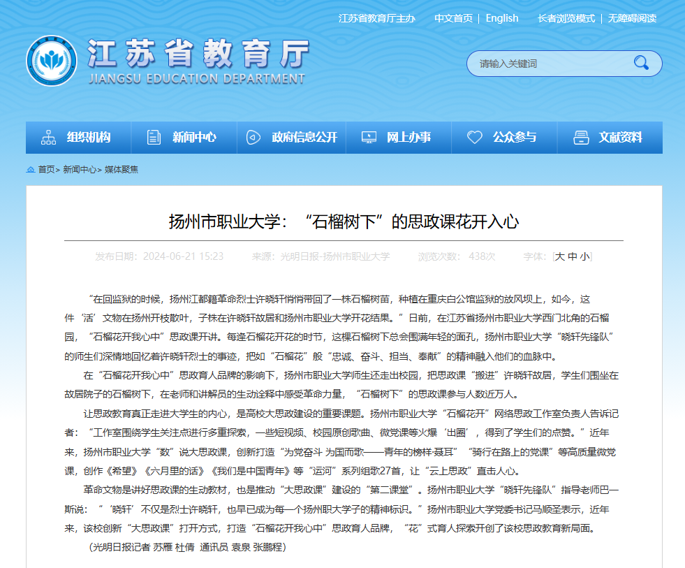 【江苏省教育厅(官网)】扬州市职业大学:“石榴树下”的思政课花开入心
