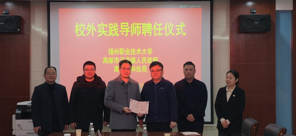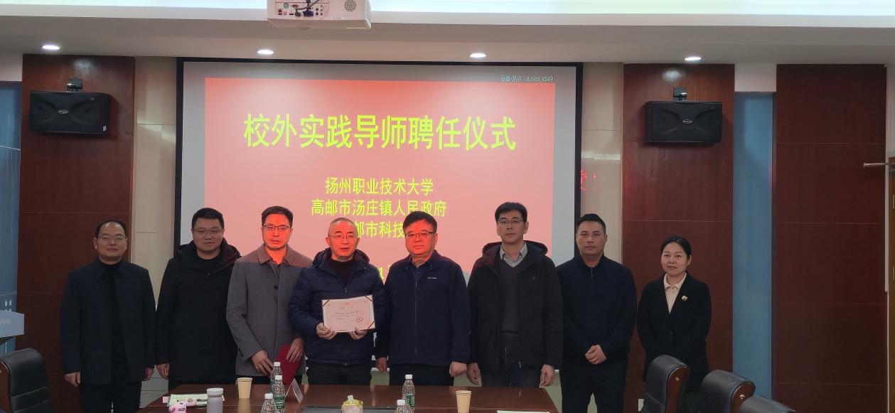仪式上,双方代表签署共建协议,并相互授予“高邮市汤庄镇技能人才培育合作基地”与“扬州职业技术大学大学生实习实训基地”牌匾。机械工程学院还为汤庄镇企业专家颁发“校外实践导师”聘书,强化校企协同育人机制。